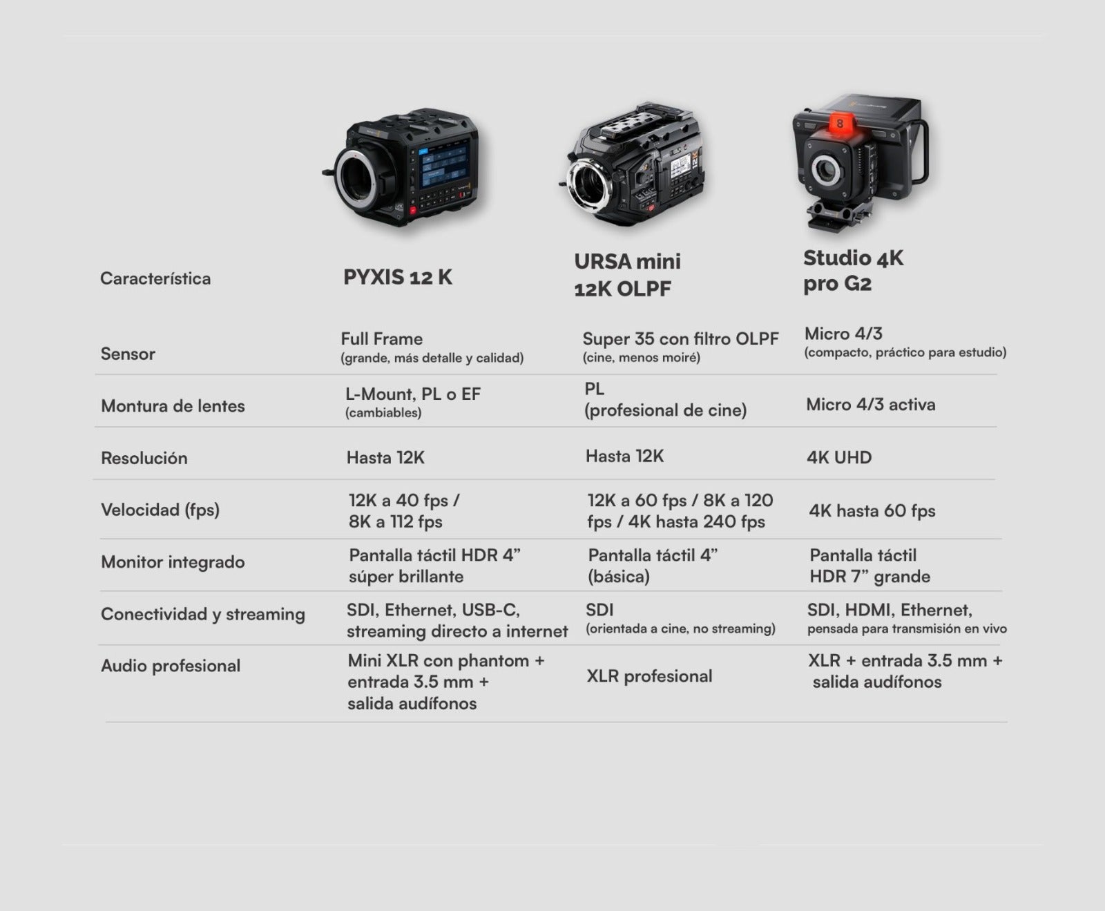 12K a 60 fps / 8K a 120 fps / 4K hasta 240 fps